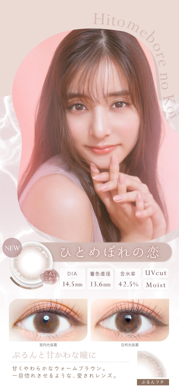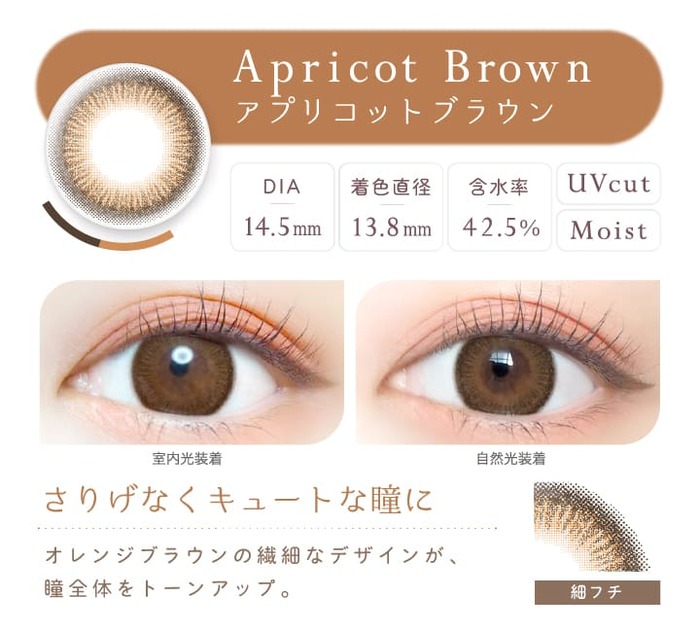直径14.5mm、自然なカラーデザインを追求。・汚れが付きにくく、乾燥しにくい非イオン性レンズ。・レンズ素材で着色部分を包み込んだラップイン構造(Wrap-In Technology)。
